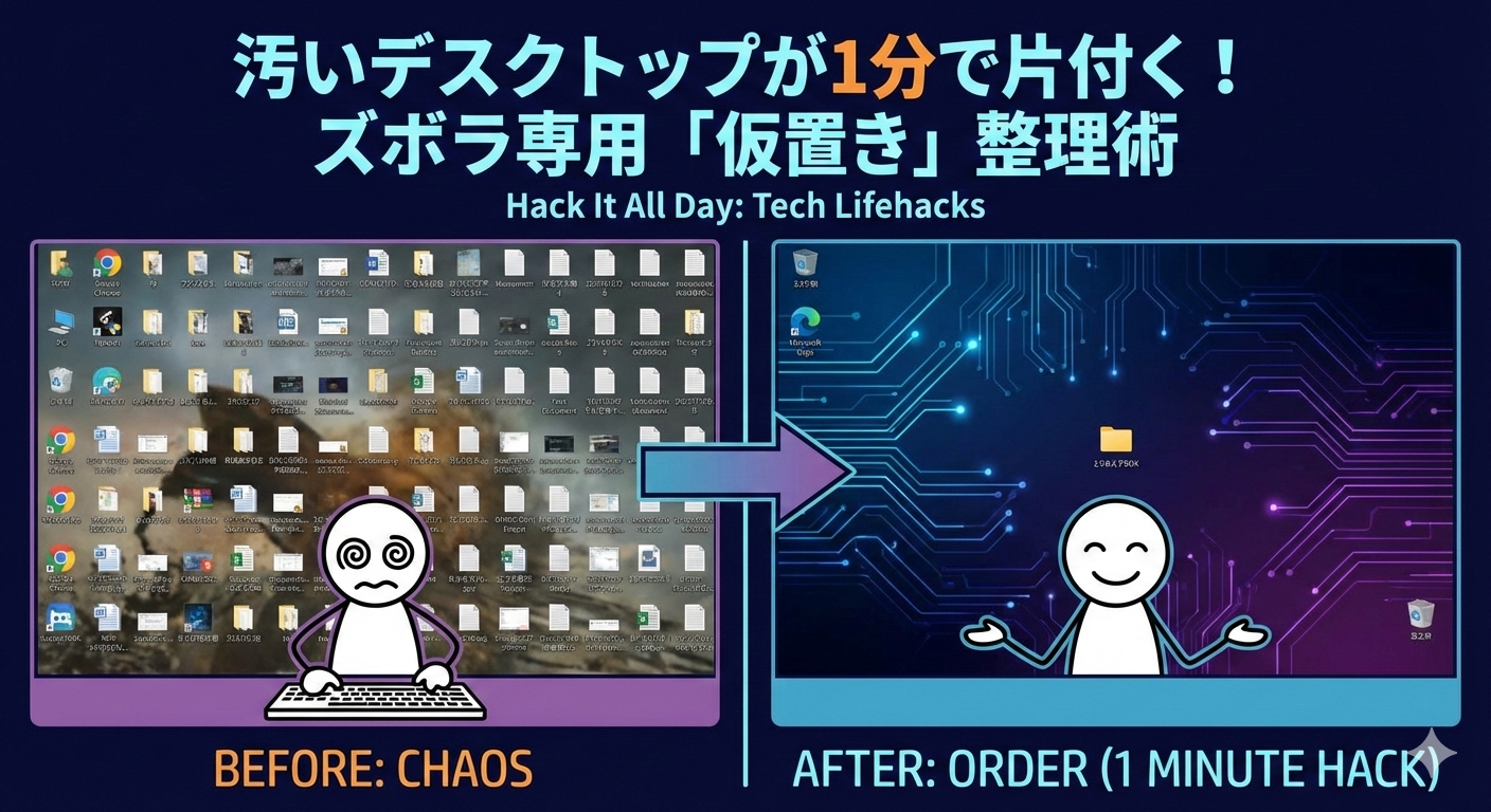 この記事では、ズボラな人こそ実践してほしい、デスクトップを1分でリセットする「仮置き」整理術を紹介します。さあ、一緒に美しい画面を取り戻しましょう!