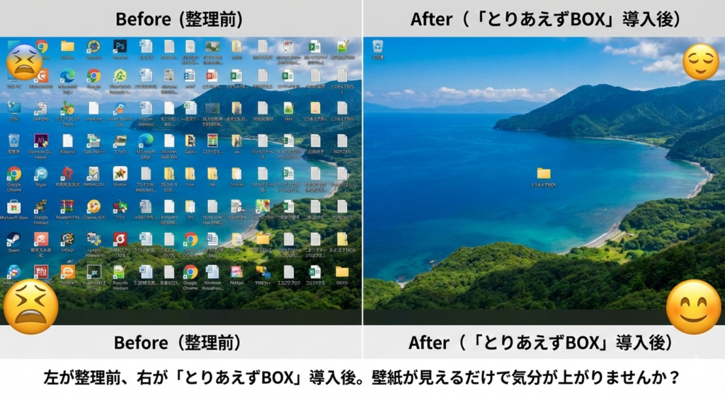 まずはデスクトップという「作業机」の上を何もない状態にすることが最優先です。ファイルが必要になったら、この箱の中を探せばいいだけ。検索範囲がデスクトップ全体から、一つのフォルダ内に絞られるだけで、探すストレスは激減します。