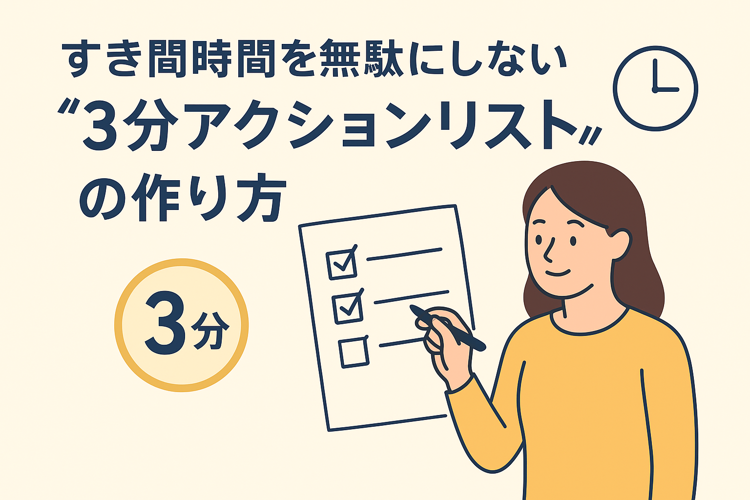 時間術 すき間時間を無駄にしない“3分アクションリスト”の作り方 日常のすき間時間を活用するための「3分アクションリスト」の作り方を解説。忙しい毎日でも実践できる具体的な方法を紹介します。 2025.09.29 時間術